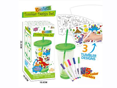 DIY涂鸦绿色双层吸管杯-恐龙/宇航员系列(500ML,可拆换,3张插片,5色笔,1包亮片)