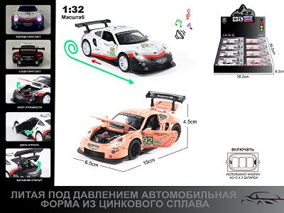 产品名称: 俄文1:32压铸锌合金灯光音效保时捷911RSR70周年纪念版赛车车模8只/展示盒