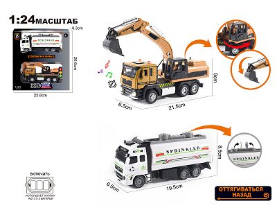 俄文1:24压铸锌合金灯光音效工程挖掘车+城市洒水车双层套装