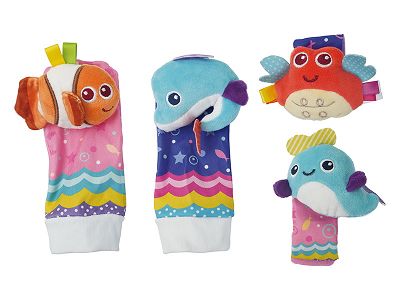 婴童毛绒玩具四件套 彩色条纹海洋动物手腕带+摇铃袜
