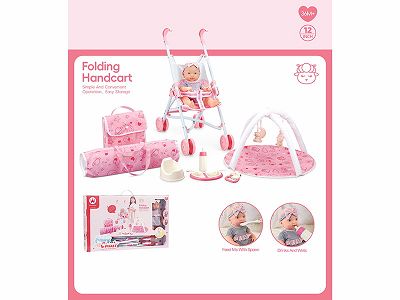 手推车+12寸头手脚搪胶身体吹气带IC,24声喝水撒尿公仔+地毯+包包